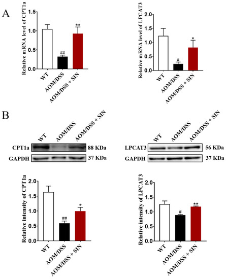 SIN consumption reshaped the lipid metabolism in CAC mice revealed by a robustly lower level of lipid identified in the SIN intervention group. Given that CPT1A and LPCAT3 play a central role in lipid metabolic balance, we next queried whether these two enzymes in colon tissue were altered in CAC mice after SIN administration. Both mRNA and protein levels of CPT1A and LPCAT3 in the colon were attenuated in AOM/DSS group relative to their controls, and SIN intervention rescued this decline (Figure 9). Taken together, these results elucidated that SIN augmented expression of CPT1A and LPCAT3, and subsequently accelerated lipid metabolism, thus inhibiting CAC.