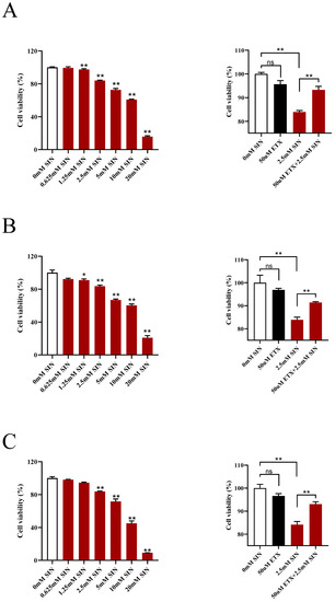Human colon cancer cells (HT-29, HCT-116 and SW-480) were obtained from the Chinese Academy of Sciences (Shanghai, China). HT-29 cells were cultured in RPMI 1640 medium (Gibco, Carlsbad, CA, USA) supplemented with 10% fetal calf serum, streptomycin (100 U/mL) and penicillin (100 U/mL). HCT-116 cells and SW-480 cells were cultured in DMEM (Gibco, Carlsbad, USA) supplemented with 10% fetal calf serum, streptomycin (100 U/mL) and penicillin (100 U/mL). They were maintained at 37 °C in a humidified environment with 5% CO2. In in vitro experiments, SIN and ETX were diluted in complete medium to obtain the required concentrations.
