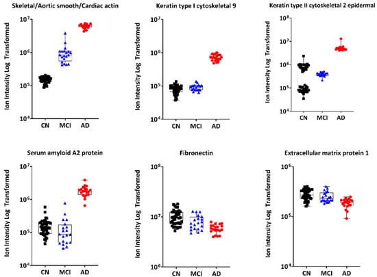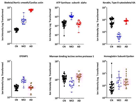 The proteomic expression indicated that some proteins are potential candidates for being MCI and/or AD biomarkers. Interestingly, skeletal/aortic smooth/cardiac actin was the strongest biomarker for both MCI and AD groups, whilst ATP synthase and serum amyloid A2 protein were specific to the MCI and AD group, respectively. To visualise the data, each of the top 6 proteins are plotted in a separate graph with the MCI group shown in Figure 2 and the AD group in Figure 3. Each of these graphs show the differences in abundance of the top proteins identified in our study between the CN, MCI and AD groups. The top-left graphs in Figure 2 and Figure 3, for instance, show the abundance level, plotted as ion intensity (log-transformed data) of skeletal/aortic smooth/cardiac actin between the three groups.