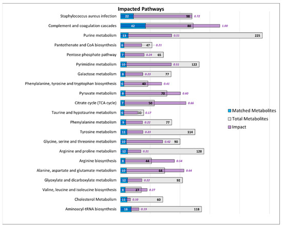Significant pathways expressed in plasma from AD and MCI (compared with CN). The number of components of each pathway is presented as “Total metabolites” (grey bars) and the number of molecules matched to these pathways are presented as “Matched Metabolites” (blue bars). The “Impact” value represents the extent to which these pathways are impacted with the disease.