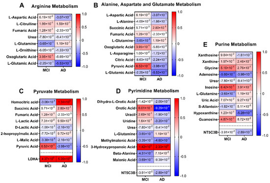 Heatmaps of metabolic pathways. Heatmaps showing metabolomic and proteomic expressions during (A) arginine metabolism, (B) alanine, aspartate, and glutamate metabolism, (C) pyruvate metabolism, (D) pyrimidine metabolism, and (E) purine metabolism in the plasma matrix of AD and MCI patients compared with CN individuals. The metabolites and proteins used in the multi-omics integration were selected based on the fold changes (Log2FC ≥ 1.00 or Log2FC ≤ −1.00) with statistically significant different false discovery rates (FDR ≤ 0.05)). The heatmaps were graphed by manually inputting the fold changes into GraphPad Prism 9.