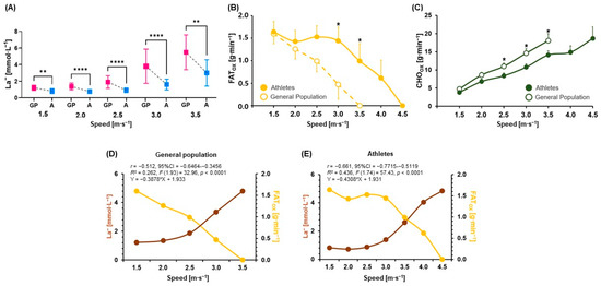 (A) La− at 1.5, 2.0, 2.5, 3.0, and 3.5 speeds of GIET between GP and A, (B) FATox between GP and A during GIET, (C) CHOox between GP and A during GIET, (D) correlation and regression analyses between La− and FATox in GP, and (E) correlation and regression analyses between La− and FATox in A. Significant differences (* p < 0.05, ** p < 0.01, **** p < 0.0001). A: athletes; CHOox: carbohydrate oxidation; FATox: fat oxidation; GP: the general population; GIET: graded incremental exercise test; La−: blood lactate concentrations. Data are mean ± standard error of the mean (S.E.M.) (A–C).