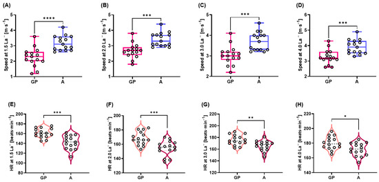 The jogging/running speeds from 1.5 to 4.0 mmol∙L−1 La− were significantly higher in A than GP, while the HR values from 1.5 to 4.0 mmol∙L−1 La− were significantly higher in GP than A (speeds: p < 0.0001; ES [d]: 1.6, p = 0.0002; ES [d]: 1.5, p = 0.0004; ES [d]: 1.4, p = 0.0006; ES [d]: 1.4, HR: p = 0.0002; ES [d]: 1.6, p = 0.0007; ES [d]: 1.4, p = 0.0047; ES [d]: 1.2, p = 0.0130; ES [d]: 1.1, respectively) (Figure 2A–H).