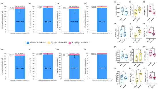 Comparisons of mean energetic contributions until 3.5 m∙s−1 steps during GIET between males and females in GP and A. (A) Overview of the three energy systems in male GP (kJ), (B) in male GP (%), (C) female GP (kJ), (D) female GP (%), (E) comparison of absolute oxidative contribution (kJ) between male and female GP, (F) glycolytic contribution (kJ) between male and female GP, (G) phosphagen contribution (kJ) between male and female GP; (H) comparison of relative oxidative contribution (%) between male and female GP, (I) glycolytic contribution (%) between male and female GP, (J) phosphagen contribution (%) between male and female GP; (K) overview of the three energy systems in male A (kJ), (L) in male A (%), (M) in female A (kJ), (N) in female A (%); (O) comparison of absolute oxidative contribution (kJ) between male and female A, (P) glycolytic contribution (kJ) between male and female A, (Q) phosphagen contribution (kJ) between male and female A; (R) comparison of relative oxidative contribution (%) between male and female A, (S) glycolytic contribution (%) between male and female A, and (T) phosphagen contribution (%) between male and female A. ns: p > 0.05, * p < 0.05, ** p < 0.01. A: athletes; GP: the general population; WOxi: oxidative system contribution; WGly: glycolytic system contribution; WPCr: phosphagen system contribution. Male GP (n = 7), female GP (n = 8), male A (n =7), and female A (n = 8). Data are mean ± standard deviation (SD) (A–D and K–N).