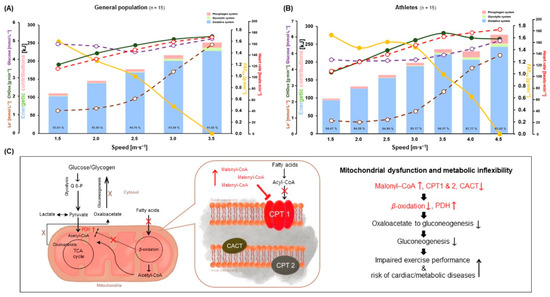 The La− levels were lower in A, in which, in turn, FATox was higher than it was in GP during GIET. This is attributable to the greater lactate elimination in A than in GP [5,10]. Measuring La− and FATox during exercise represents an alternative approach to reflecting mitochondrial function and metabolic flexibility in ambulatory and clinical settings [5]. Recent studies suggest that GP and A with relatively poor endurance capabilities cannot efficiently oxidize fat during low to moderate exercise [5,10,16]. Accordingly, they use more carbohydrates and produce higher La−, while the uptake of free fatty acids can be inhibited by accumulated malonyl-Coenzyme A (CoA), which decreases carnitine palmitoyltransferase 1 (CPT1) activation, beta (ß)-oxidation in mitochondria, and gluconeogenesis [5,10,37]. Beyond the difficulties of fatty acid oxidation in the form of mitochondrial dysfunction in individuals with metabolic syndrome, an impaired ability to eliminate pyruvate and lactate by oxidation and gluconeogenesis affect the formation of malonyl-CoA, which is an inhibitor of CPT1 and decreases mitochondrial fatty acid uptake and oxidation (Figure 4C) [5,10,38]. During lactate re-metabolism, such as at low-exercise intensities, fatty acid derivatives are oxidized in mitochondria and can increase acetyl-CoA [5,10,39]. Furthermore, ß-oxidation in mitochondria inhibits pyruvate dehydrogenase (PDH). However, the tricarboxylic acid cycle is substituted, to enable continued anaplerosis and pyruvate carboxylase (PC), because inhibited PDH is the major anaplerotic enzyme that immediately synthesizes oxaloacetate from pyruvate [10,39]. This anaplerotic mechanism is necessary for gluconeogenesis, lipogenesis, and ATP re-synthesis from lactate during low-intensity exercise in well-trained athletes [5,10,21,40]. FATox activates crucial enzymes and hormonal responses of gluconeogenesis such as pyruvate kinase, PC, phosphoenolpyruvate carboxykinase, epinephrine, glucagon, cortisol, and other related regulators such as cyclic adenosine monophosphate and intracellular Ca+ handling [10,16,17]. In these regards, comparisons of CHOox between both groups and negative correlation and regression analyses between La− and FATox support these mechanisms and the differences in mitochondrial function between both groups [5]. Higher CHOox in GP showed increased contributions of absolute and relative WGly compared with A during GIET. Moreover, different values of WOxi in % were affected by higher WPCr and WGly in kJ. However, there were no differences in absolute WOxi and WTOTAL between both groups. The predominance of energetic contributions during GIET was WOxi between both groups, including males and females in GP and A. The values of WOxi were indicated to be over 90% up to 3.5 m∙s−1 steps during GIET in GP and A. However, relative WOxi (%) in A was progressively decreased with increasing exercise intensity from 4.0 to 4.5 m∙s−1 because of the increased anaerobic contributions, such as the increased lactate production rate (a reduction in WOxi of only 8.6% from the first to the last stage). These phenomena were also confirmed in a previous study by Bertuzzi et al. [41], in which a similar incremental exercise test on the treadmill was performed with male recreational long-distance runners. Regarding gender differences in energetic contributions, males in GP exhibited absolute and relative lower WGly and higher WPCr than females in GP; there were no significant differences in WOxi. However, a higher trend toward WOxi was observed in male GP than in female GP, while males and females in A showed no significant differences, although there were similar tendencies to GP among the three energy systems (Figure 3A–T). Skeletal muscle mass and all fiber types are greater in males than in females. The difference between males and females is especially pronounced in type II fibers, which results in a greater ratio of type II fiber mass to type I fiber mass in males, including higher PCr pool, La− production and elimination, and oxidative capacity [14,42,43,44,45]. On the other hand, greater skeletal muscle microvascular reactivity in the form of microvascular dilation and arterial diameter resulting in greater blood flow may affect gender differences in reperfusion capacity, which are also positively associated with cardiovascular fitness [14,37,46,47,48]. The abovementioned factors might differentially influence metabolic energy contributions between males and females in GP and A.