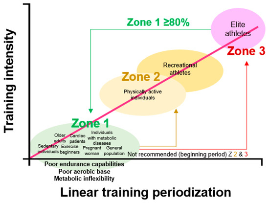 In previous studies, the volume of individualized low-intensity exercises (ILIE), such as high-volume training (HVT) (zone 1, <2 mmol∙L−1 La−), were mostly performed (approximately ≥ 80%) by elite athletes such as runners and marathoners, to improve their performances during preparatory, pre-competitive, and competitive periods [49,50,51]. Furthermore, the typical linear training periodization focuses on increased aerobic base such as increased mitochondrial number, ATP re-synthesis from lactate, and capillary density [10,16,21,49]. ILIE/HVT are performed before the greater volume of high-intensity exercise is increased [21,49,52]. Most regular exercise prescriptions for the public health recommend that moderate to high-intensity physical activity/exercises be performed for at least 150 min (3–5.9 metabolic equivalents, METs) and 75 min (≥6 METs) per week [28,53]. However, sedentary individuals, cardiac patients, exercise beginners, and individuals with metabolic syndrome cannot immediately begin performing at these exercise intensities because their levels of physiological performance are low, consisting of poor FATox and directly higher utilization of carbohydrates, thus resulting in metabolic inflexibility. This was confirmed in a previous study [5] and in our present study. Recent studies have indicated that 1-h ILIE at zone 1, including a recovery domain between 4 and 9 weeks, improves the exponential lactate curve (rightward shift) in adults and professional soccer players during GIET [16,17]. In particular, Hwang et al. [17] suggest an exercise intensity at 72% from the lactate threshold 1 (before LT1), which improves the lactate curve at zones 1, 2 (moderate/threshold), and 3 (high), including the recovery domain and enhanced FATox. Therefore, the general population may perform more aerobic training at zone 1 to improve their metabolic flexibility (FATox and re-metabolism from La−), which can enable greater volumes at zones 2 and 3 and protect against cardiac/metabolic diseases [5,49] (Figure 5).
