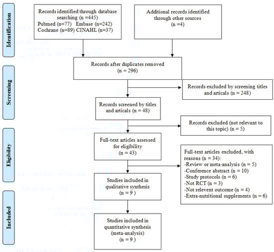 The results of the literature search are illustrated in Figure 1. A total of 449 articles, which included four additional articles identified through hand-searching of reference lists, were identified in the literature search. One hundred and fifty-three articles were duplicates, 248 articles were excluded by screening titles and abstracts, and five articles were removed due to not being relevant to this topic. After full-text articles had been assessed and studied for eligibility, nine articles were deemed eligible in our study. The reasons for exclusion are shown in Figure 1.