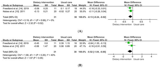 Two studies [10,14] investigated the effect of healthy DPs on blood-glucose-related indicators. As shown in Figure 3, a fixed-effects model was used to assess the outcomes because no significant heterogeneity was observed between the two groups _(HbAlc: p = 0.660, I2 = 0%; homeostasis model assessment of insulin resistance (HOMA-IR): p = 0.200, I2 = 40%). Compared with that in the usual-care group, a healthy DP could significantly improve the HbAlc (MD: −0.13; 95% CI: −0.24, −0.02; p = 0.020). There was no difference in improving HOMA-IR (MD: −0.52; 95% CI: −1.04, −0.00; p = 0.050), while there was an improving trend in the healthy DP group.
