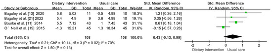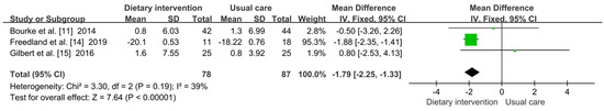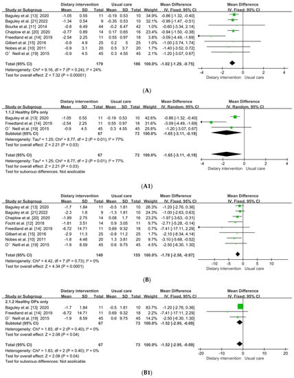 Eight studies [10,12,13,14,15,19,20,21] involving 304 participants evaluated the effect of healthy DP on BFM. Figure 4B showed that the fixed effects model was used as there was no significant heterogeneity (p = 0.73, I2 = 0%). Compared with that in the usual-care group, healthy DP could significantly lower BFM (MD: −1.78; 95 %CI: −2.58, −0.97; p < 0.001). Subgroup analysis was performed to observe the effect of healthy DP only on BFM. The results suggested that healthy DP only could significantly reduce BFM (MD: −1.52; 95% CI: −2.95, −0.09; p = 0.040) with low heterogeneity (p = 0.40, I2 = 0%) (Figure 4B1).