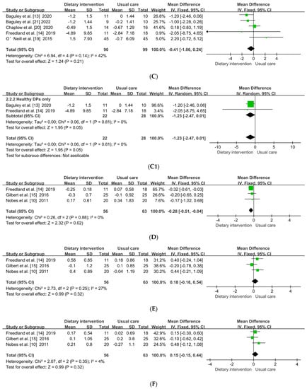 Five studies [13,14,19,20,21] involving 189 participants assessed the effect of healthy DP on BLM. The fixed effects model was used as there was no significant heterogeneity (p = 0.14, I2 = 42%). Compared with that of the usual-care group, healthy DP did not obviously increase BLM (MD: −0.41; 95% CI: −1.06, 0.24; p = 0.21) (Figure 4C). We performed subgroup analysis to observe the effect of healthy DP only on BLM. Due to high heterogeneity found in the healthy DP subgroup only (p = 0.100, I2 = 56%), the random effects model and sensitivity analysis was performed. After O’Neill et al. [19] was removed, the results suggested that healthy DP only could not significantly increase BLM (MD: −1.23; 95% CI: −2.47, 0.01; p = 0.050) (Figure 4C1), while there was a trend of decreased BLM.