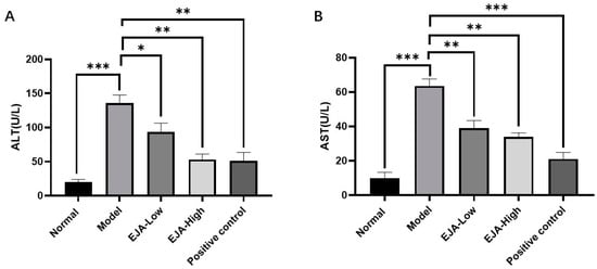 A. japonica treatment attenuated Con A-induced acute liver injury. (A) Effect of EJA on serum ALT levels; (B) Effect of EJA on serum AST levels. (ns = nonsignificant, * p < 0.05, ** p < 0.01, and *** p < 0.001 among the compared groups. Student t-test was performed. EJA: A. japonica extract).
