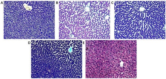 Histopathological observation (A) Control group; (B) Model group; (C) A. japonica low dose group; (D) A. japonica high dose group; and (E) Positive control group (Bifendate, BFD). Scale bar = 200 µm.