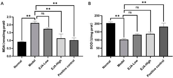 A. japonica alleviates the level of oxidative stress induced by acute liver injury. (A) MDA levels in rat liver tissues; (B) SOD activity in rat liver tissues, Student’s t-test was performed (ns: not significant, ** p < 0.01).