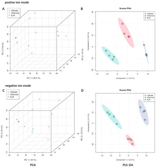 Discrimination of plasma metabolic profiles in normal group (CNormal), model group (CModel), and EJA administered group. Plots of PCA scores (A) and PLS-DA scores; (B) in positive ion mode; Plots of PCA scores; (C) PLS-DA scores; and (D) in negative ion mode.
