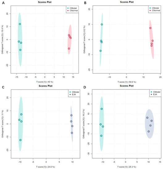 To obtain sufficient metabolite information, plasma samples from the normal group, the model group, and the A. japonica extract (EJA) group were analyzed in positive and negative ion modes. As shown in Figure 4A,C, the PCA score plot shows the distribution between the three groups in 3D space. Samples from the same group are almost clustered together and within the 95% confidence interval, the variables observed in the samples are confirmed to be biologically relevant.