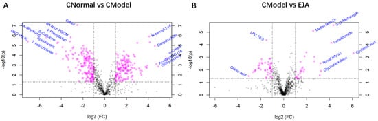 Volcano plots show trends in differential metabolite expression in the control versus model groups and in the model versus administered groups (Figure 6). Each dot represents a specific metabolite. The left side of the origin refers to the down-regulated metabolites and the right side of the origin refers to the up-regulated metabolites.