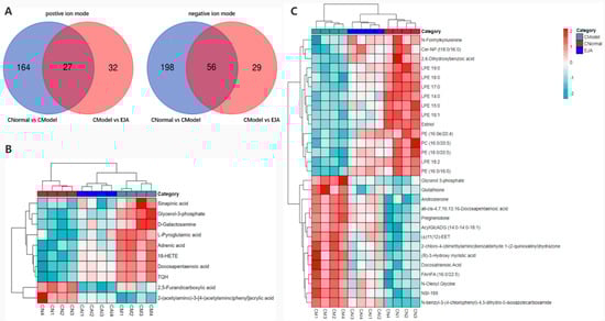(A) Venn diagram showing the overlapping metabolites in different groups; (B) differential metabolite correlation thermal images in positive ion mode; and (C) differential metabolite correlation thermal images in negative ion mode.