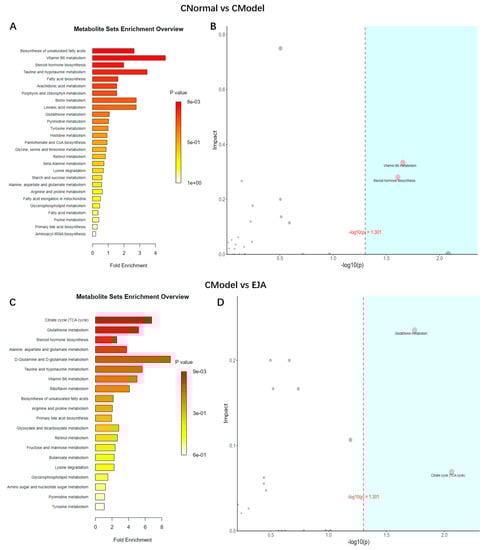 Significantly different metabolites were selected, and Over-Representation Analysis (ORA) was used to find the KEGG pathways that were significantly enriched in these metabolites and calculated the topological influence. For the significantly enriched KEGG pathways, metabolic pathway diagrams were drawn and metabolites with significant differences were marked in the pathway diagrams. The results showed that the differences in metabolic pathways between the control group and the model group included unsaturated fatty acid biosynthesis, vitamin B6 metabolism, steroid hormone biosynthesis, taurine, and hypotaurine metabolism (Figure 8A). The most relevant metabolic pathways are vitamin B6 metabolism and steroid hormone biosynthesis (Figure 8B). The differences in metabolic pathways between the model group and EJA group included citric acid cycle (TCA cycle), glutathione metabolism, steroid hormone biosynthesis, alanine, aspartate, and glutamate metabolism (Figure 8C), among which the TCA cycle and glutathione metabolism are the most important (Figure 8D).