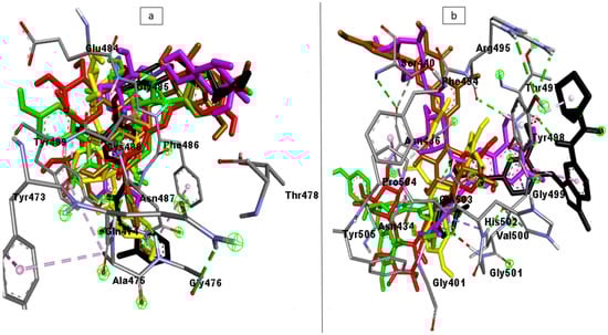 The superimposition and interactions of the top-ranked investigated LOCM compounds (Maysin (red), 6-Hydroxylcyanidin-3-rutinoside (purple), Kaempferol-7-glucoside (brown), Geraniin (green), epigallocatechin gallate (yellow), and cataposide (yellow)), and reference standard (black), with the highest binding affinity with the RBD residues of the co-crystal structure of (a) SC-2WT and (b) Omicron SP.