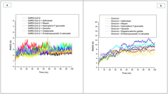 The thermodynamic binding free energy measures the difference in energy between a complex and its unbound component, and the higher the negative value, the better the ligand’s affinity for the protein [24]. Since zafirlukast among the reference standards demonstrated better affinity towards the SPs of omicron and SC-2WT through molecular docking, zafirlukast was selected as the standard for thermodynamic binding free energy calculation and subsequent MD simulation analysis. Remarkably, two (maysin, and 6-hydroxycyanidin-3) of the four LOCM compounds with broad-spectrum activities against both variants had better affinity toward the SP of omicron than SC-2WT (Table 2). Maysin and 6-hydroxycyanidin-3, with binding free energies of −34.85 kcal/mol and −28.84 kcal/mol, respectively, against SC-2WT SP had −38.88 kcal/mol and −42.97 kcal/mol against omicron SP (Table 2). The better affinity of maysin and 6-hydroxycyanidin-3 against omicron SP suggests their likely capability to modulate the mutated RBD of omicron than geraniin and Kaempferol-7-glucoside and hence their advantage as omicron SP inhibitors. However, of the four compounds with broad spectrum activities identified through the molecular docking, only maysin (SC-2WT (−34.85 kcal/mol), omicron (−38.88 kcal/mol) and geraniin (SC-2WT (−36.90 kcal/mol), omicron (−31.28 kcal/mol)) had better binding free energy against SPs of both variants than zafirlukast (SC-2WT/omicron: −33.73 kcal/mol/−22.38 kcal/mol) after 100 ns MD simulation (Table 2). While this observation partially agrees with the results of the molecular docking, it further highlights the superior broad-spectrum advantage of maysin and geraniin as omicron and SC-2WT SPs inhibitors relative to zafirlukast. Specifically, against both targets, 6-Hydroxycyanidin 3-rutinoside and Kaempferol-7-glucoside had the highest binding free energy against the omicron and SC-2WT SPs, respectively (Table 2). Generally, while maysin and 6-hydroxycyanidin-3 had higher binding free energy towards the SPs of omicron than SC-2WT, geraniin and Kaempferol-7-glucoside, on the other hand, had better affinity towards SC-2WT than omicron SP. Remarkably, maysin and geraniin showed superior broad-spectrum advantage against SP of both variants than zafirlukast, while 6-Hydroxycyanidin 3-rutinoside and Kaempferol-7-glucoside had the best binding free energy against the SPs of omicron and SC-2WT, respectively. All these observations point to the different capabilities of the top-ranked compounds, with maysin and geraniin being the best in terms of their broad-spectrum capability to act against infection that may arise as a result of either the SC-2WT or omicron variant.