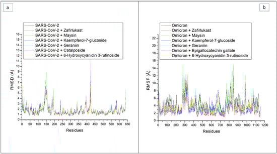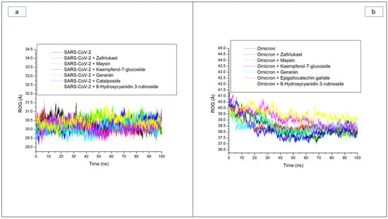 Besides RMSD, the ROG also measures stability and the overall compactness of a ligand–receptor complex, and its lower values connote better complex folding with less conformational entropy [28]. In this study, fewer fluctuations in compactness observed with the SC-2WT SP system (Figure 3a) during the 100 ns simulation period could mean that the binding of the investigated high-ranked compounds and zafirlukast to the SC-2WT SP induced little effect on its folding. This observation was supported by their respective average ROG values with an overall small variation of 0.3 Å among all systems, with the geraniin-SC-2WT SP complex having the lowest values (Table 3). A logical inference from this observation is that, though top-ranked compounds do not cause excessive folding of the SC-2WT SP, they do however maintain the thermodynamic entropy of the protein, and this is consistent with the results of RMSD values, suggesting their thermodynamic stability towards SC-2WT SP. However, against the omicron SP, a continuous reduction in ROG value depicts folding was observed throughout the 100 ns simulation period for all the systems (Figure 3b). This observation was more prominent with the unbound omicron SP (38.07 Å) relative to the bound systems (Table 3), which could be an indication that the increased structural stability in terms of RMSD observed with the investigated compounds and zafirlukast against the omicron SP relative to the unbound omicron SP was not due to protein folding. This observation is consistent with the findings of Aribisala and Sabiu [23], where the structural stability observed in the RMSD finding of phenolics and penicillin-binding protein 2a contradicted ROG predictions. Among the bound systems, Kaempferol-7-glucoside (38.12 Å) followed by maysin (38.20 Å) had the lowest average ROG values against omicron SP (Table 3). Kaempferol-7-glucoside having the lowest average ROG value against omicron SP is surprising, as the compound had the lowest binding free energy with the highest RMSD value against the target. Similarly, 6-Hydroxycyanidin 3-rutinoside (39.50 Å), with the highest average ROG value, had the highest binding free energy and lowest average RMSD value against omicron SP (Table 3). These observations regarding the average ROG values further imply that the increased structural compatibility noted with the average RMSD values in this study was not due to protein folding, and further corroborate earlier findings that ROG may be affected by several characteristics specific to the protein such as protein topology, size, length, point of interactions, and amino acid packing [24,29,30]. In the case of omicron spike protein, the multiple mutations in the target could have affected the protein topology, size, and length relative to SC-2 SP and hence the observed variations in the average RMSD and ROG values of both targets. Between the two compounds (geraniin and maysin) with a better broad spectrum of activity than zafirlukast, maysin seems to be more thermodynamically compatible with omicron SP than SC-2WT SP and vice versa for geraniin, further corroborating the RMSD findings. On the other hand, 6-Hydroxycyanidin 3-rutinoside and Kaempferol-7-glucoside, with the best affinity and structural stability towards omicron SP and SC-2WT SP, respectively, had the highest average ROG values against the respective protein, which further emphasized that the increased structural stability observed with the compounds might not be due to protein folding.