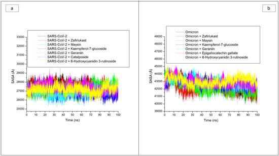 Comparative solvent accessible surface area (SASA) plots of alpha-carbon, top five LOCM compounds, and zafirlukast against the spike protein of (a) SARS-CoV-2 wild-type and (b) omicron, after 100 ns MD simulation period.