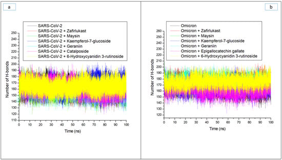 Time evolution of the number of hydrogen bonds in (a) SARS-CoV-2, and (b) Omicron spike proteins following binding of top five LOCM compounds and zafirlukast during the 100 ns MD simulation period.
