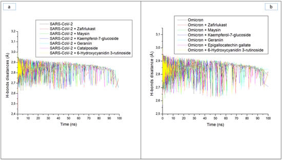 Time evolution of the hydrogen bond distance in (a) SARS-CoV-2, and (b) Omicron spike proteins following binding of top five LOCM compounds and zafirlukast during the 100 ns MD simulation period.