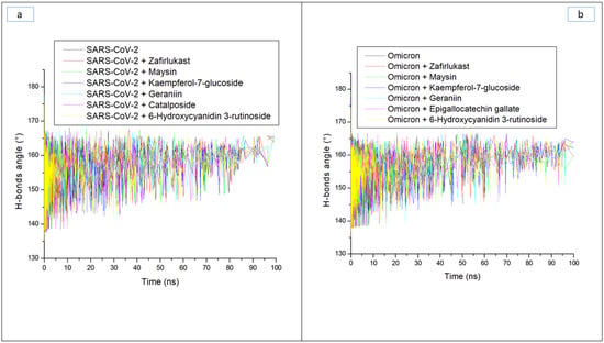 Time evolution of the hydrogen bond angles in (a) SARS-CoV-2, and (b) Omicron spike proteins following binding of top five LOCM compounds and zafirlukast during the 100 ns MD simulation period.