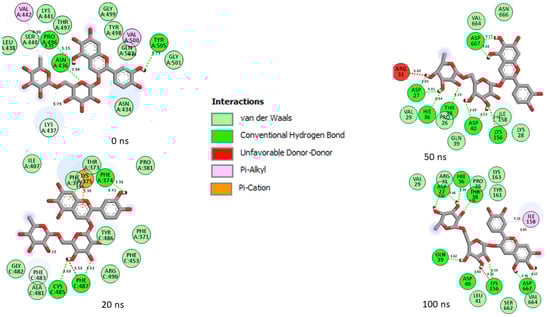 Plot of interactions of Kaempferol-7-glucoside against the SP of SC-2WT at different timeframes during the 100 ns simulation. At 0 ns, RBD residues such as 489, 486, 484 and 487 could be seen in the interaction plot of the complex. At 20 ns, a significant change in the amino acid interactions took place that was consistent throughout the simulation and, as a result several common amino acid residues, could be observed at the interaction timeframes of 20 ns, 50 ns and 100 ns.