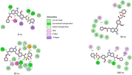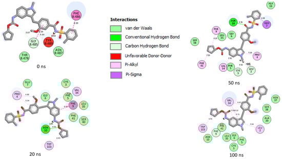 Plot of interactions of zafirlukast against the SP of SC-2WT at different timeframes during the 100 ns simulation. At 0 ns, RBD residues such as 489, 486, and 487 could be seen in the interaction plot of the complex. At 20 ns, a significant change in the amino acid interactions occurred that was consistent throughout the simulation and, as a result, several common amino acids could be observed at the interaction timeframes of 20 ns, 50 ns and 100 ns.