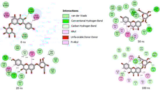 Generally, a ligand’s capacity to bind and inactivate a protein is governed by many thermodynamic parameters relating to amino acid residue flexibility, protein stability, compactness, and, most critically, the nature of contacts with essential amino acids [35,39,40]. Thus, in this study, the number, nature, and length of bond interactions formed by the top five LOCM compounds and zafirlukast with SC-2WT and omicron SP after 100 ns were analyzed. The plot of interactions at different timeframes of interactions for zafirlukast and LOCM compounds with the highest binding free energy against SPs of omicron and SC-2WT are presented in Figure 9, Figure 10, Figure 11 and Figure 12, while the plots of interactions after 100 ns for the other top LOCM compounds are presented in Table S2. The nature, bond lengths, and numbers of interactions of the top five LOCM compounds and zafirlukast against the two investigated SPs vary from one compound to another and were noted to have impacts on the binding free energy observed in this study. Bond interactions including hydrogen bonds (conventional and carbon), Van der Waals, amide π-stacked, π-anion, π-sigma, π-cation, π-π t-cation, π-π t-shaped, π-π t-stacked, π-alkyl, alky, π-Sulphur, and some unfavorable donor–donor interactions were observed. Specifically, maysin interacting with the highest number of interactions (26) with omicron SP does not justify its lower binding free energy relative to 6-Hydroxycyanidin 3-rutinoside (19 interactions (Figure 9)) which has the highest binding free energy. However, when the nature of the interactions between both compounds with omicron SP was further analyzed, the presence of two unfavorable donor–donor interactions in the maysin–omicron SP complex interactions, indicative of repulsive forces [24,40], might have drastically reduced the binding free energy score of maysin against omicron SP relative to 6-Hydroxycyanidin 3-rutinoside with one unfavourable bond (Figure 9, Table 6). Furthermore, the maysin–omicron SP complex (4.89 Å) had a higher average bond length than 6-Hydroxycyanidin 3-rutinoside (4.65 Å) against omicron SP. Longer bond lengths signify less pull between two intra- or inter-molecules [28], and the longer bond lengths between maysin and omicron SPs relative to 6-Hydroxycyanidin 3-rutinoside against omicron SP could have further drastically reduced the effects of the higher number of interactions between maysin and omicron SPs observed in this study. Despite the diminishing factors in the maysin and omicron SP interactions, maysin still had better binding free energy than the other LOCM compounds and zafirlukast (Figure 10), indicating how promising the compound is as an omicron SP inhibitor. Interestingly, except for kaempferol-7-glucoside (two interactions with one hydrogen contact) against omicron SP, all the investigated top-ranked compounds had higher numbers of interactions and hydrogen bond contacts than zafirlukast (12 interactions with three hydrogen bond contacts) (Table 6). This observation agrees with the binding free energy findings in this study, where kaempferol-7-glucoside was the only compound with a lower binding free score than zafirlukast and, hence, emphasizes the importance of the number of interactions and hydrogen bond contacts in binding free energy determination as earlier reported [31]. Furthermore, all the investigated compounds had lower average bond length interactions against omicron SP relative to zafirlukast + omicron SP (Figure 10, Table 6), further highlighting the importance of bond length in the determination of binding free energy scores. Unlike the omicron SP plots with the investigated compounds, Kaempferol-7-glucoside with the highest binding free energy against SC-2WT SP also had the highest number of interactions (21), seven of which are important interactions with Tyr32, Phe9, Val34, Leu35, Phe5, Ala30, and Val34 (Figure 11, Table 6). Furthermore, with the exception of 6-Hydroxycyanidin 3-rutinoside + SC-2WT SP (4.60 Å), Kaempferol-7-glucoside (4.62 Å) interacted with the lowest average bond lengths against SC-2WT SP. These observations further lend credence to the importance of the number, nature, and length of interaction in the higher binding free energy score observed in the Kaempferol-7-glucoside interaction plot with SC-2WT SP. However, zafirlukast having a lower number of interactions and hydrogen bond contacts against SC-2WT SP (Figure 12, Table 6) relative to catalposide and 6-Hydroxycyanidin 3-rutinoside does not justify its higher binding free energy than its complexes with SC-2WT SP (Table 6). However, the higher number of important interactions (6) with Val34 (4), Trp103, and Leu2 observed in the zafirlukast + SC-2WT SP plot (Figure 12) relative to five and three interactions formed between 6-Hydroxycyanidin 3-rutinoside and catalposide, respectively, against SC-2WT SP (Table S2 and Table 6) could have partially contributed to the higher binding free energy of zafirlukast against SC-2WT SP. Bond analysis into the interaction plots of maysin and geraniin (the two LOCM compounds with higher binding free energy than zafirlukast against SP of omicron and SC-2WT) revealed why they had better broad spectrum activities than zafirlukast and why maysin was more thermodynamically compatible with omicron SP and vice versa for geraniin against SC-2WT. Against omicron, both compounds had higher numbers of interactions (maysin (26), geraniin (15)) and hydrogen contacts (maysin (nine), geraniin (four)) with lower average bond lengths of interaction (maysin (4.89 Å), geraniin (4.69 Å)) than zafirlukast with maysin having the highest number of interactions and hydrogen bond contacts (Table 6). Similarly, against SC-2WT, maysin, and geraniin had higher numbers of hydrogen bond contacts (maysin (4), geraniin (8)) with significantly lower average bond length of interaction (maysin (4.72 Å), geraniin (4.67 Å)) than zafirlukast (Table 