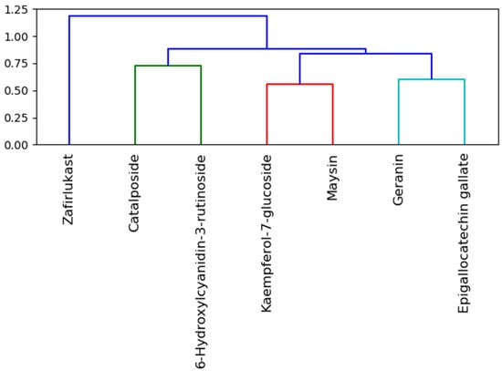Similarity clustering of the top-ranked LOCM compounds and zafirlukast. Clusters in the dendrogram are color-coded with molecules with the same color and clusters more similar than those with different colors and clusters. Also, the horizontal axis displays the similarity score, and the lesser the similarity scores of two compounds, the more similar they are to one another.