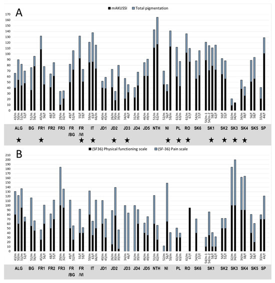 Comparison of (A) cAKUSSI (sum of mAKUSSI and total pigmentation), and (B) the physical functioning and pain scales from the self-administered SF-36 questionnaire in the siblings analyzed in our study. Age and sex are shown (m-male, f-female), the younger sibling is always to the left. Individual sibling groups are separated by a gap. Generally, an increase in cAKUSSI score indicates a worsening of the disease manifestations and this increases with age (A). In families marked by star the cAKUSSI score was higher in a younger sibling. In the SF-36 questionnaires (B), a score of 100 indicated no symptoms, whereas 0 indicated extreme symptoms; thus, the lower the score the more disability.
