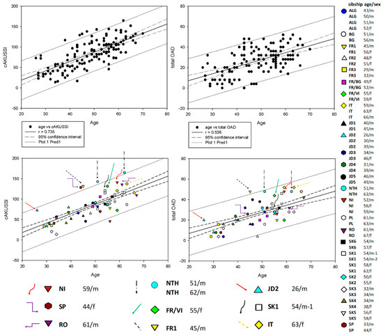 Pearson correlation of cAKUSSI (left) and total OAD (right) with age. Horizontal axis indicates the age of the patients. The upper panels show the regression analysis with all 139 SONIA 2 AKU patients. The lower panels show (on the background of the same chart) all 24 sibling pairs. The legend on the right-hand side indicates individual sibling pairs or groups, with age (in years) and sex indicated. Colored arrows indicate specific patients discussed in the text.