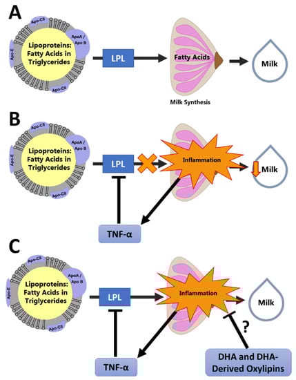 Conceptual Model of the Effect of Inflammation on Milk Production. This conceptual framework illustrates how oxylipins may be involved in resolution of mammary inflammation, leading to improved milk synthesis: (A) Fatty acids are oxidized by the mammary gland for energy and used as substrate for synthesis of the milk fat globule. This process requires uptake of fatty acids from the circulating lipoproteins by LPL. (B) Inflammation causes suppression of LPL by TNF-α, reducing fatty acid availability in the mammary gland and reducing milk synthesis. (C) We hypothesize that pro-resolving oxylipins, such as those derived from docosahexaenoic acid (DHA), reduce mammary inflammation and promote normal fatty acid uptake and milk synthesis.