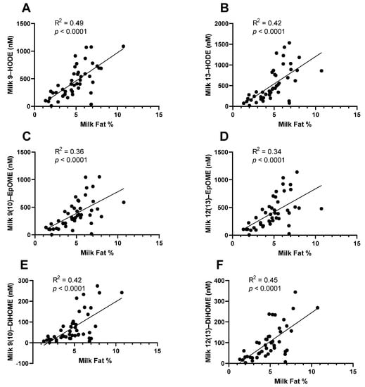 Total (esterified + non-esterified) oxylipins measured in whole milk are strongly correlated with total milk fat. Samples were collected as part of a case–control study of low milk supply. Most oxylipins, including the linoleic acid-derived oxylipins, (A) 9-HODE, (B) 13-HODE, (C) 9(10)-EpOME, (D) 12(13)-EpOME, (E) 9(10)-DiHOME, and (F) 12(13)-DiHOME, were strongly correlated with the total milk fat measured in the sample (n = 46).