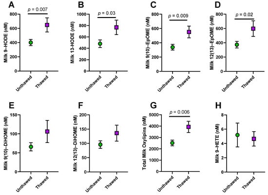 Our research group had access to milk samples from a case–control study [] of low milk supply which had been stored for 4–7 years at −80 °C. Some of these samples had not been previously thawed, while others had been thawed multiple times. In order to determine which samples should be considered for oxylipin analysis, we analyzed total oxylipin (esterified + non-esterified) concentrations for differences between the unthawed samples and those that had been previously thawed and found that previously thawed samples had significantly higher concentrations of many oxylipins (Previously unpublished data; Figure 3A–G).