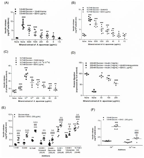 Effects of EEAS on insulin secretion from (A,B) clonal pancreatic β-cells (BRIN-BD11) and (C) islets of Langerhans, (D) glycation of protein, (E) secretion of insulin with known stimulators/inhibitors, and (F) with/without extracellular calcium from clonal β-cells. Values n = 4–8 for insulin secretion and glycation of protein are mean ± SEM. *, **, *** p < 0.05–0.001 compared to control. ϕ, ϕϕ, ϕϕϕ p < 0.05–0.001 compared to 5.6 mM glucose with EEAS. ΔΔ, ΔΔΔ p < 0.05–0.001 compared to respective incubation without EEAS. EEAS, ethanol extract of A. squamosa.