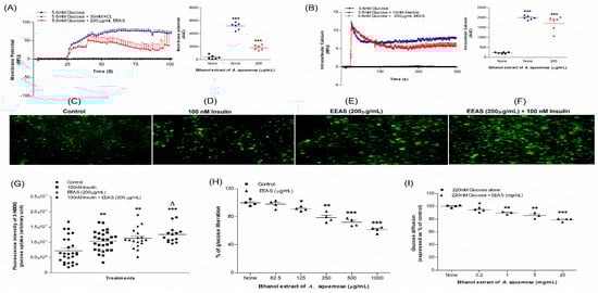 Effects of EEAS on (A) membrane potential and (B) intracellular calcium in clonal pancreatic β cells (BRIN BD11), and (C–G) glucose uptake, (H) starch digestion, and (I) glucose diffusion in vitro. Changes of fluorescence intensity in differentiated 3T3L1 adipocytes incubated with EEAS (E) without or (F) with 100 nM insulin. Values n = 6 for membrane potential and intracellular calcium, n = 4 for uptake of glucose, digestion of starch, and diffusion of glucose are mean ± SEM.*, **, *** p < 0.05–0.001 compared to control. Δ p < 0.05 compared to 100 nM insulin alone.