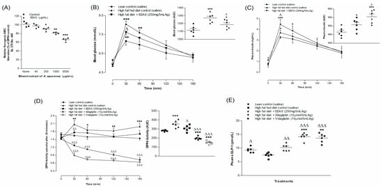 Effects of EEAS on (A) DPP-IV enzyme in vitro, (B) glucose tolerance, (C) plasma insulin, (D) DPP-IV, and (E) active GLP-1 (7-36) in high-fat-fed rats. In vivo parameters were evaluated before and after oral gavage of glucose alone (18 mmol/kg body weight (b.w.), control) or with EEAS (250 mg/5 mL/kg b.w.), sitagliptin and vidagliptin (both at 10 μmol/5 mL/kg b.w.). Plasma active GLP-1 (7-36) levels was assayed at 30 min after treatments. Values n = 4 for in vitro DPP-IV enzyme activity and n = 6 for in vivo parameters are mean ± SEM. *, **, *** p < 0.05–0.001 compared to control. Δ, ΔΔ, ΔΔΔ p < 0.05–0.001 compared to high-fat-fed diet control rats.