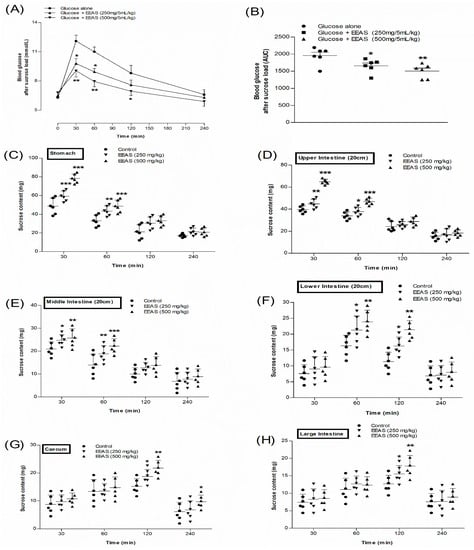 To examine the effects of EEAS on the absorption of sucrose from the GI tract, the residual sucrose content was measured as described earlier []. Rats fasted for 24 h were orally administered a sucrose solution (2.5 g/5 mL/kg) in the presence or absence of EEAS (250 mg/5 mL/kg and 500 mg/5 mL/kg). Blood samples were obtained from the tail tip at 0, 30, 60, 120, and 240 min. To determine the amount of unabsorbed sucrose, the rats were sacrificed at the specified times as above and the gastrointestinal tract (GIT) was divided into six segments as indicated in Figure 4C–H. Each segment was washed out with ice-cold saline, acidified with H2SO4, and centrifuged at 3000 rpm (1000× g) for 10 min. The supernatant obtained was boiled for 2 h to hydrolyse the sucrose followed by neutralisation with sodium hydroxide to bring the pH to 7.0–7.4 []. The blood glucose levels after sucrose load and the amount of glucose liberated from the residual sucrose in the GIT were measured [].