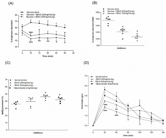 A combination of EEAS (500 mg/5 mL/kg b.w.) with glucose caused a significant decrease in intestinal glucose absorption (p < 0.05–0.001; Figure 5A) throughout most of the perfusion time. Similarly, in the presence of EEAS at 250 mg/5 mL/kg, glucose absorption was suppressed in the gut at 10, 15, and 30 min compared to the control (glucose alone) (p < 0.05–0.001; Figure 5A). The area under the curve indicated that EEAS suppressed intestinal glucose absorption by 22–32% (Figure 5B).