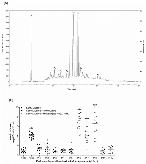 Representative (A) HPLC profile and (B) insulinotropic properties of EEAS peak fractions (1–10). At a flow rate of 5.0 and 1.0 mL/min, samples were run in RP-HPLC using linear gradients of 20% over 10 min and 70% over 40 min. Peak fractions (1–10) detected at 254 nm were further tested for insulin-releasing properties using clonal pancreatic BRIN-BD11 β-cells. Values n = 8 for insulin release are mean ± SEM. *** p < 0.001 compared to control.