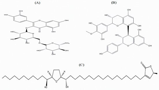 Chemical structure of putative phytomolecules derived from the EEAS. (A) Rutin, (B) proanthocyanidin, and (C) squafosacin G chemical structures with their respective molecular formulae: C27H30O16, C31H28O12, and C37H68O5.