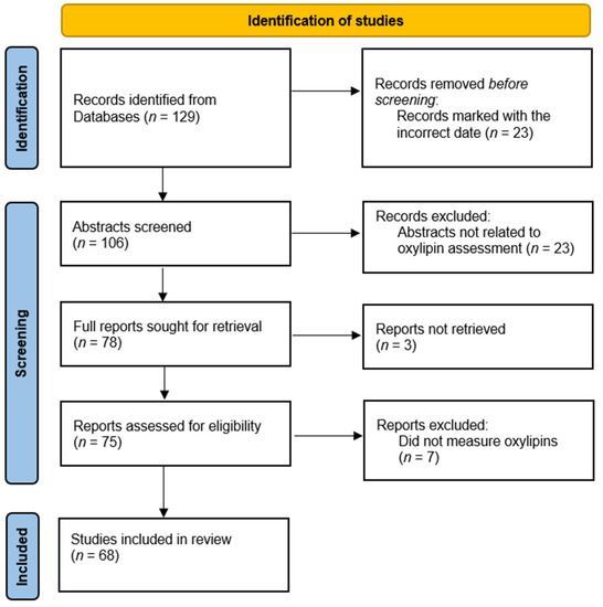 PRISMA Table for Study Identification. PRISMA table shows the process for identifying records to include in our survey of publications, reproduced from the 2020 PRISMA guidelines [25]. Records were pulled from PubMed using “plasma”, “oxylipin”, “oxylipid”, and oxylipin class names (DiHETE, DiHETrE, DiHOME, EpDPE, EpETE, EpETrE, EpOME, HDoHE, HEPE, HETE, HODE, HpETE, KETE, KODE, resolvin, maresin, protectin, EET, EEQ, EEP, DHET, OXO-ODE, OXO-ETE), carried out in humans, limited to the year 2020, and published in English.