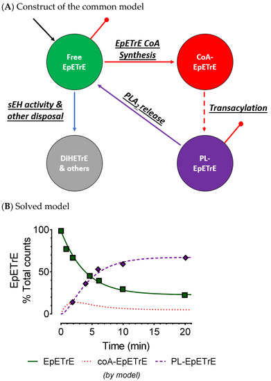 Intracellular esterified oxylipins: Few studies in tissues or cells explore esterified oxylipins. Early studies report their presence in tissues acylated into the glycerolipids of renal [53], hepatic [54], cardiac [55], lung [56], and more [57], and have been detected in the phospholipid and triglyceride pools [58] although they are present in other glycerolipid pools as well. 12-HETE is present in eosinophils almost entirely in phospholipids and triglycerides [58]. Few longitudinal measures of cellular oxylipins are available—a number of reports include time-dependent data from phospholipid oxylipins, however we identified three with extant, time-dependent data describing the distribution of epoxides and alcohols among cell esterified and non-esterified compartments [24,30,31]. While each use the common, Lands cycle, model of PLA2-mediated release and recycling (Figure 2) [59] as a guide for oxylipin signaling, none employ formal compartmental modeling. Without formal modeling it is difficult to assess whether recycling of oxylipins occurs, the prevalence of recycling relative to novel synthesis of oxylipins from AA, or to predict how the system might respond to stimuli or perturbances. Experiments using radioactive isotope incorporation into rat liver tissue explants by Karara et al. [53] had data of sufficient quality and nature for kinetic modeling. We digitally extracted the data from the original manuscript using a data digitizer (automeris.io/WebPlotDigitizer/) and used the extant data to construct a compartmental model applying the EpETrE data to the construct in Figure 2. This allowed us to evaluate the common model’s validity for EpETrEs and demonstrate how the esterified and non-esterified EpETrE pools are likely to interact. The excellent fit of data to the model confirms the validity of the common model and describes a system with rapid uptake and incorporation of EpETrE from the non-esterified pool into phospholipids, followed by a slower, PLA2-mediated release to the non-esterified pool (Table 2). The slowest step is the removal of EpETrE from the non-esterified pool by either soluble epoxide hydrolase (sEH) or by other mechanisms. This step was not well resolved from zero, but we estimate the rate for esterification into phospholipids is approximately 30-fold greater than that of the final inactivation rate, and the result is a system that undergoes substantial recycling of EpETrE back and forth between phospholipids and the non-esterified pool, about 12 times in total. This means PLA2 directly releases oxylipins; moreover, at any time the majority of oxylipins in the non-esterified pool appear there by direct, PLA2-mediated hydrolysis of oxylipins from membrane phospholipids (aka oxylipin recycling), not from PUFA-driven oxylipin synthesis.