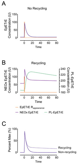 - Steady-state: Compared to a non-recycling system, the basal steady-state concentrations in recycling system producing 1 U/min EpETrE were much greater: 5.8 U vs. 58 U. This drastic difference is largely a function of the permanent disposal, and indicates that in cells undergoing basal oxylipin synthesis, steady state levels are a function of net disposal (e.g., sEH activity), not recycling.