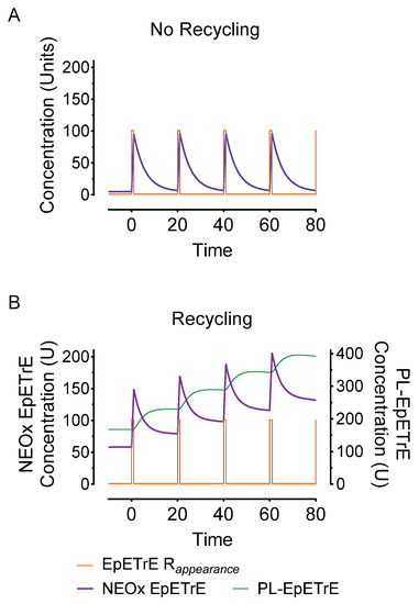 Figure 4. Effect of repeated stimuli on non-recycling (model A) and recycling systems (model B). To illustrate the impact of successive intervals of EpETrE appearance, the simulations in Figure 3 were modified to simulate repeated pulsed appearance of EpETrE (100 U over 1 min) every 20 min (EpETrE Rappearance). This feature demonstrates how a recycling system (model B) is better organized for signal amplification in response to successive stimuli. As in Figure 3, concentrations are in arbitrary units (U).