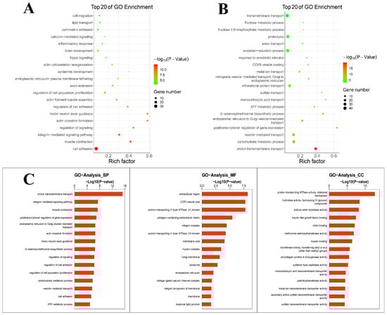 GO enrichment analysis. (A) GO enrichment analysis of down-regulated genes. (B) GO enrichment analysis of up-regulated genes. (C) A summary of the biological processes, molecular functions and cellular components of differentially expressed genes.